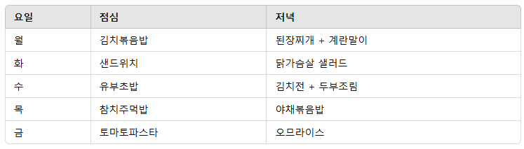 추천 식단 예시 (1인 기준)